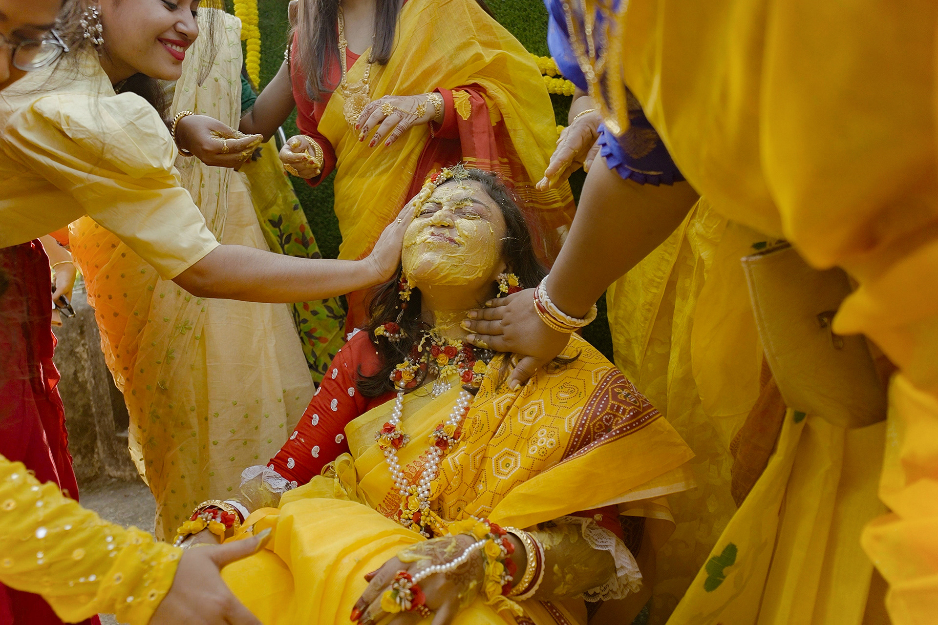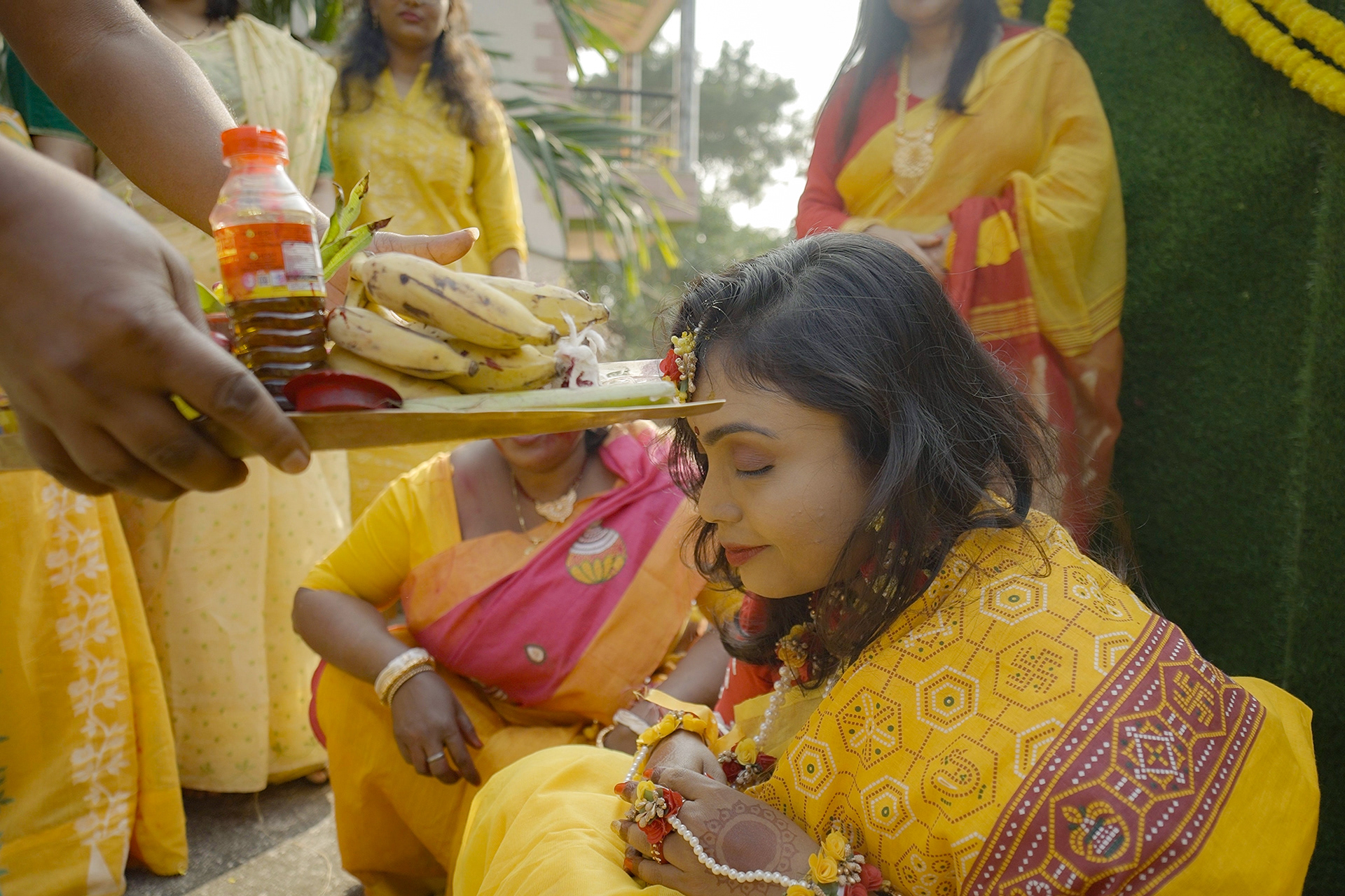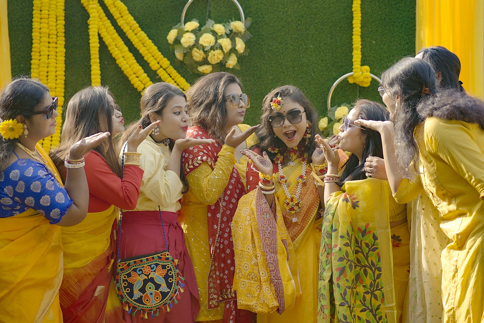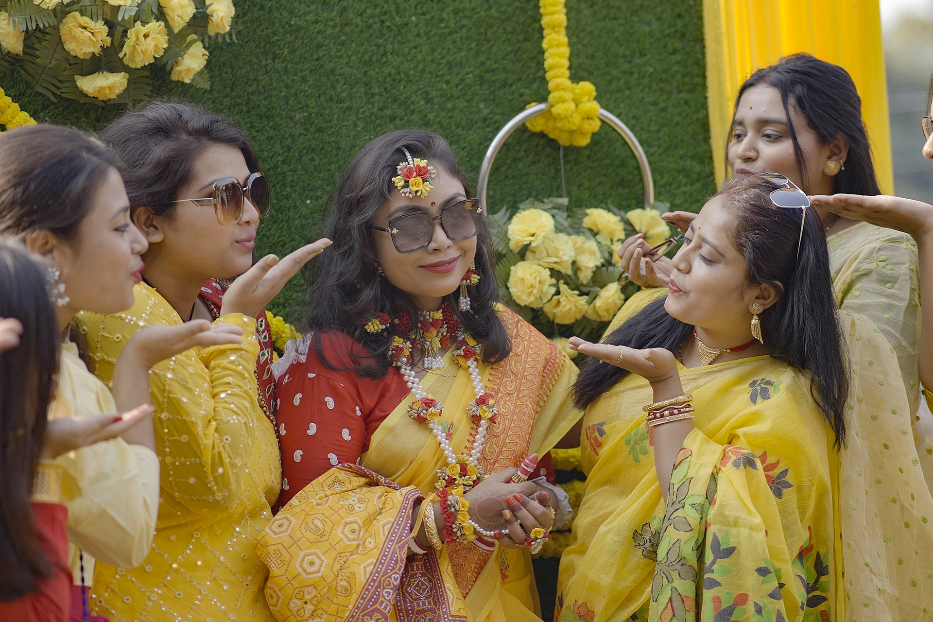 Manomita and Amiyo's Haldi ceremony was a vibrant and joyous celebration, filled with the warmth of closest friends and family. The atmosphere buzzed with laughter and excitement as everyone indulged in the traditional rituals, smearing turmeric on the couple amidst cheerful banter and heartfelt blessings. The golden hue of the Haldi added a radiant glow to the day, symbolizing prosperity and happiness for the couple. It was a memorable event, marking the beginning of their beautiful journey together.